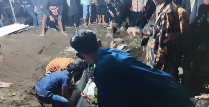 Prosesi pemakaman berlangsung dengan tertib dan penuh rasa hormat. Tangis keluarga pecah saat jenazah diturunkan ke liang lahat, menandai perpisahan terakhir yang begitu berat.