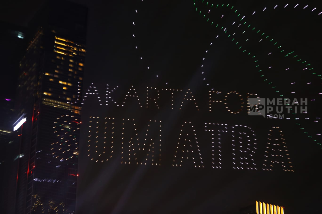 Atraksi drone tersebut menampilkan beragam visual yang sarat makna. Salah satunya adalah tulisan “Jakarta for Sumatera”, sebagai pesan solidaritas dan dukungan terhadap wilayah Sumatera yang terdampak bencana. Formasi kemudian berubah membentuk slogan “Road to Jakarta 500”, menyiratkan visi pembangunan kota menuju masa depan yang lebih maju. Tak berhenti di situ, drone juga menampilkan maskot Je, Ka, dan Te yang merupakan karakter identitas baru kota, menarik perhatian para penonton terutama anak-anak.