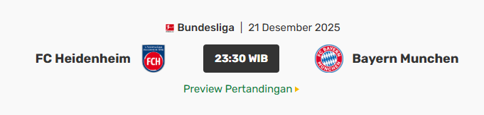 Pertandingan Heidenheim vs Bayern Munchen pada pekan ke-15 Bundesliga 2025/2026 akan menjadi laga penutup paruh pertama sebelum kompetisi memasuki jeda musim dingin. Duel ini dijadwalkan berlangsung di Voith-Arena pada Minggu, 21 Desember 2025, dengan kick-off pukul 23.30 WIB. Di atas kertas, laga ini terlihat timpang karena mempertemukan tim papan bawah melawan pemuncak klasemen, namun tetap menyimpan dinamika menarik untuk dicermati.