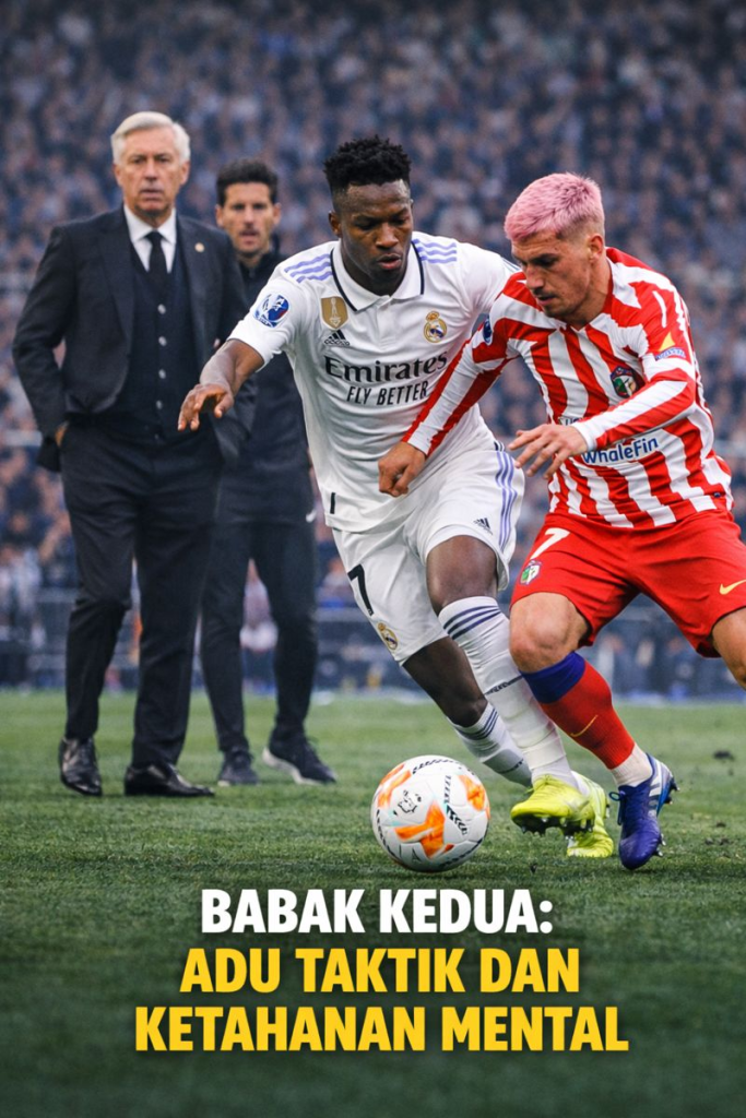 Memasuki babak kedua, pertandingan berjalan semakin taktis. Real Madrid berusaha mengontrol tempo dengan penguasaan bola yang lebih stabil, sementara Atletico Madrid tetap setia dengan pendekatan disiplin dan agresif.